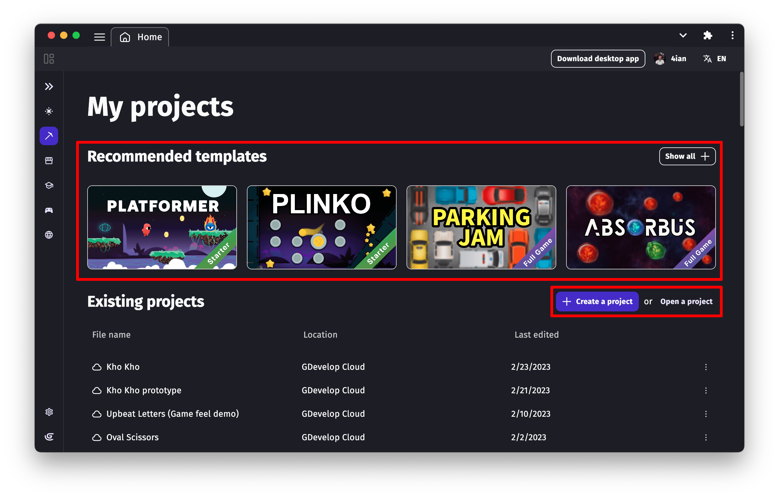 When you launch GDevelop, you can choose a game template that can be customized in a few minutes (which is great for getting a feel for game creation), open a game template in the editor, or start from scratch.