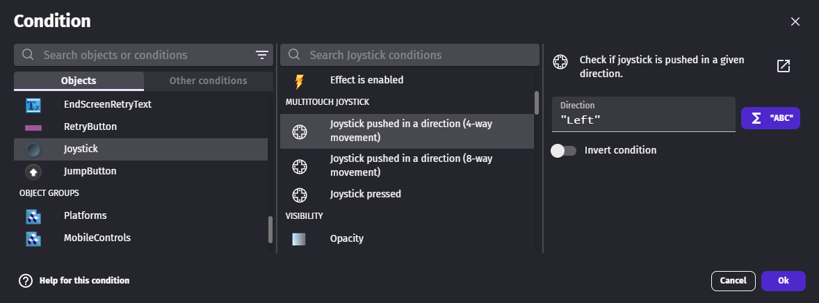 Joysticks and buttons can be used to create controls similar to a real gamepad. Interactions of each player can be checked with the conditions in the following screenshot.