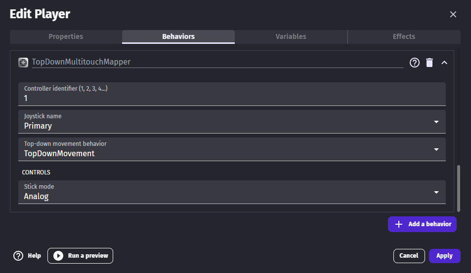 The "3D shooter multitouch controller mapper" behavior can be added to a 3d physics character to make the character move according to player touches automatically.