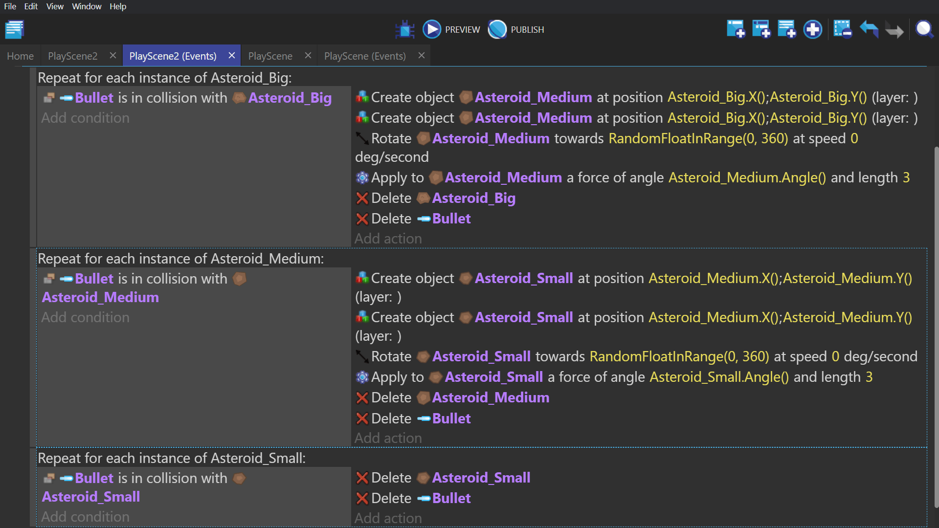 Action: -"Create an object" and select Asteroid_Medium. Set this to create at the X and Y coordinates of Asteroid_Big. -Copy and paste that "Create an object" action in to the same event, so a second medium asteroid is created when the big asteroid is destroyed. -"Rotate toward angle" setting RandomFloatInRange(0, 360) as the angle to rotate towards, with an angular speed of 0. -"Apply force (angle)" (Physics Engine) setting the angle to be the angle of the medium asteroids. With a length of 3. -"Delete the object" and select the big asteroid. -"Delete the object" and select the bullet.