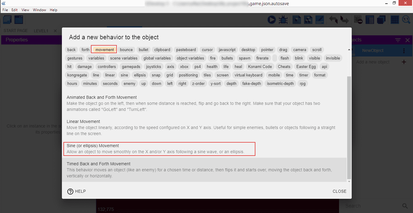And find "movement". We will use the "Ellipse movement" to animate the title image, so it's not a static one and the whole main menu will look better.