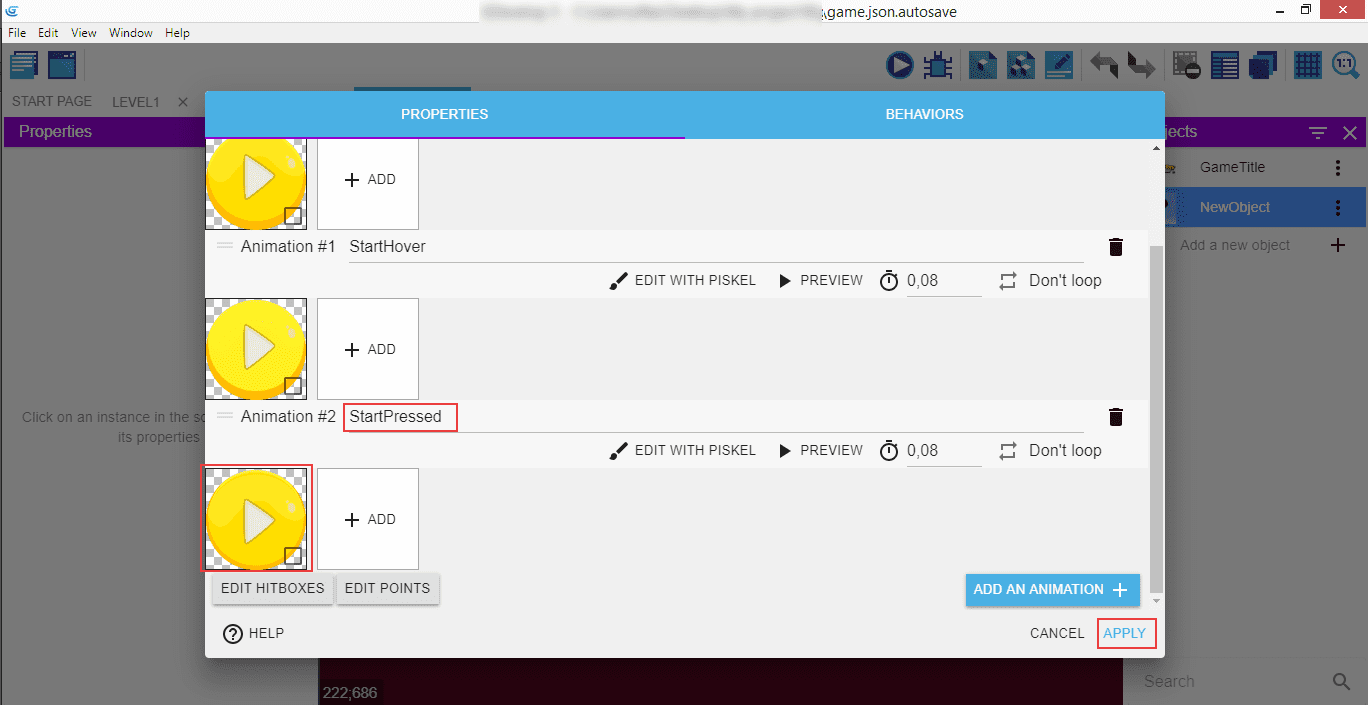 Add another two animations with their respective images: "StartHover" and "StartPressed".