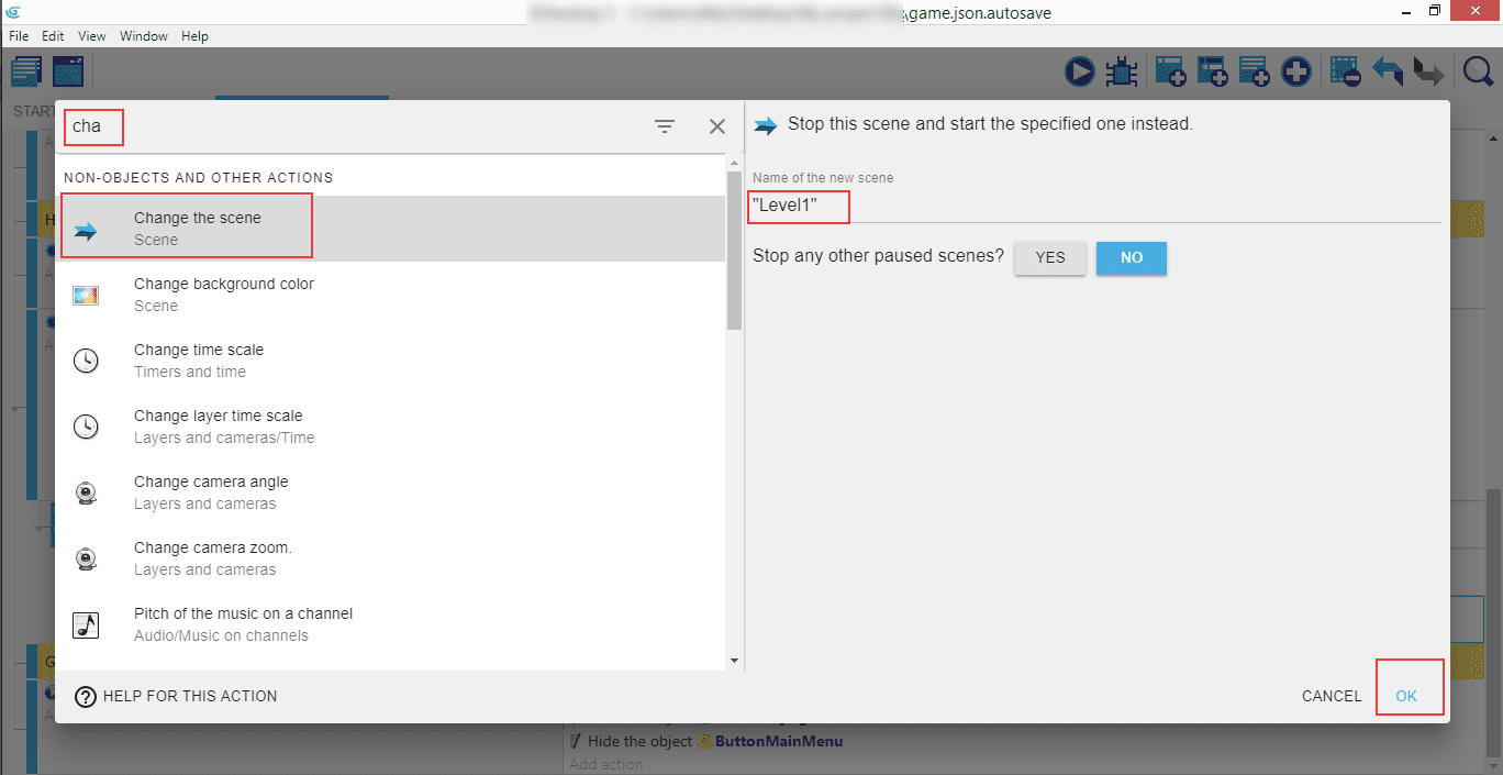 The action this button is going to perform is changing the scene to the actual game. Search for "Change the scene", then select "Level1".