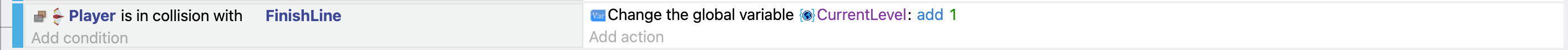 Open the Events tab, and add a new condition to determine the collision between Player and FinishLine. Then, create a new global variable called CurrentLevel and set to 1.