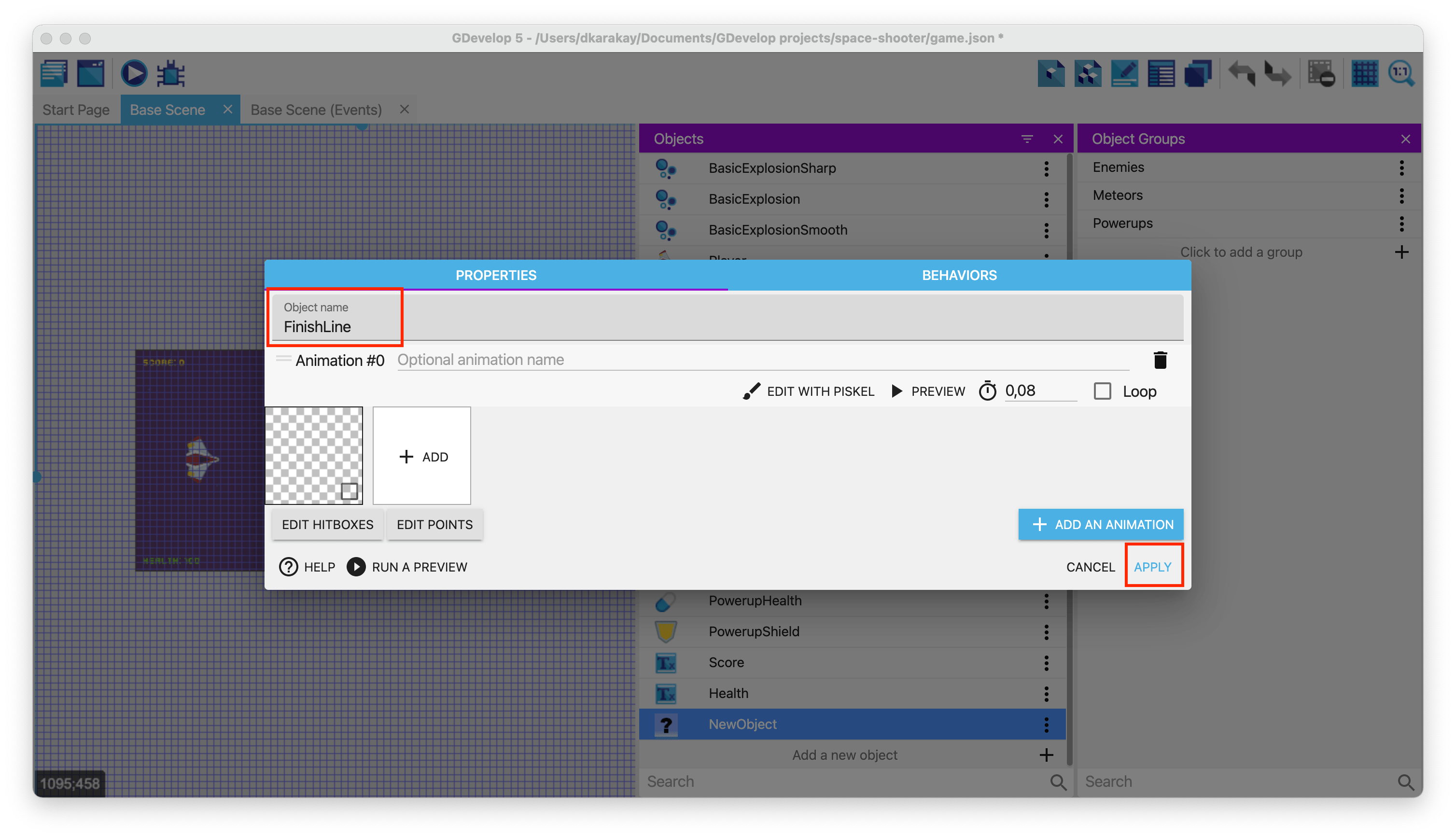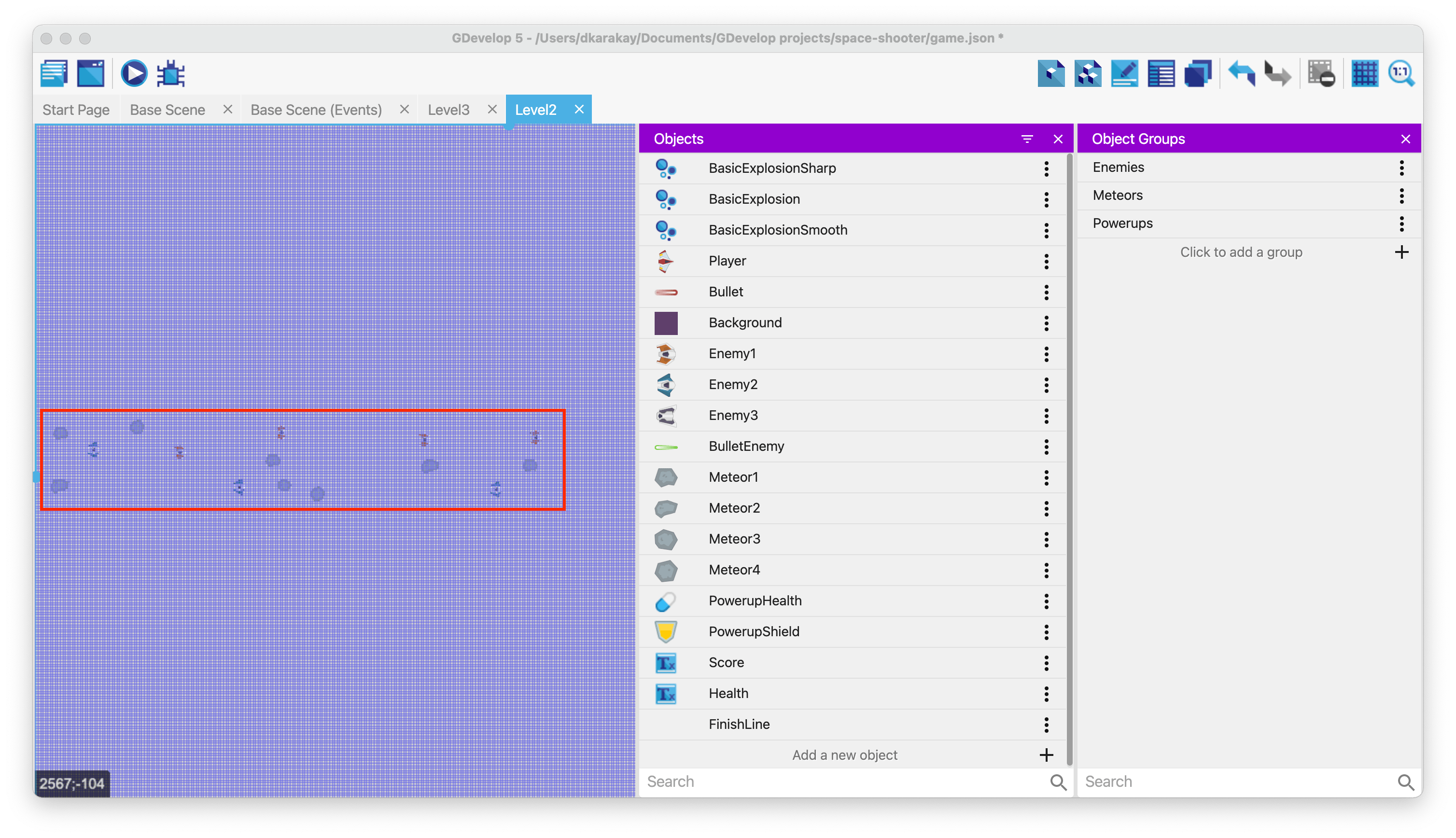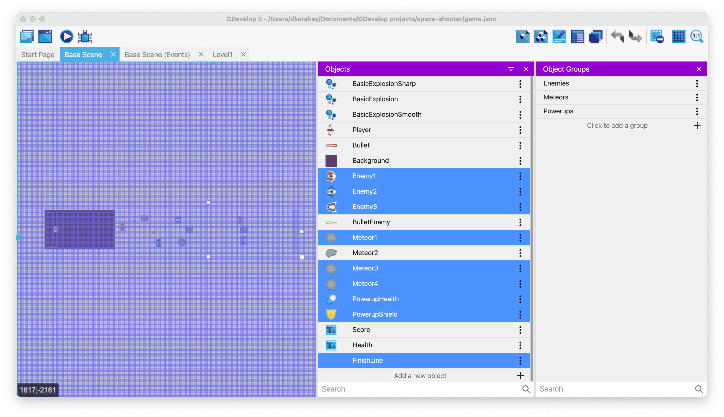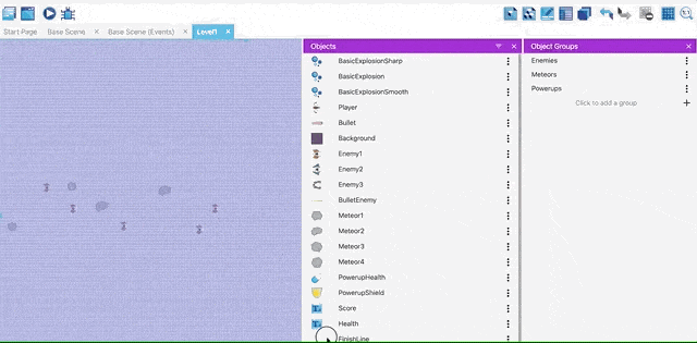 Now, we should go back to the Base Scene and delete all enemies, powerups, meteors, and the finish line. We will add those objects and set up our levels in the external layouts.