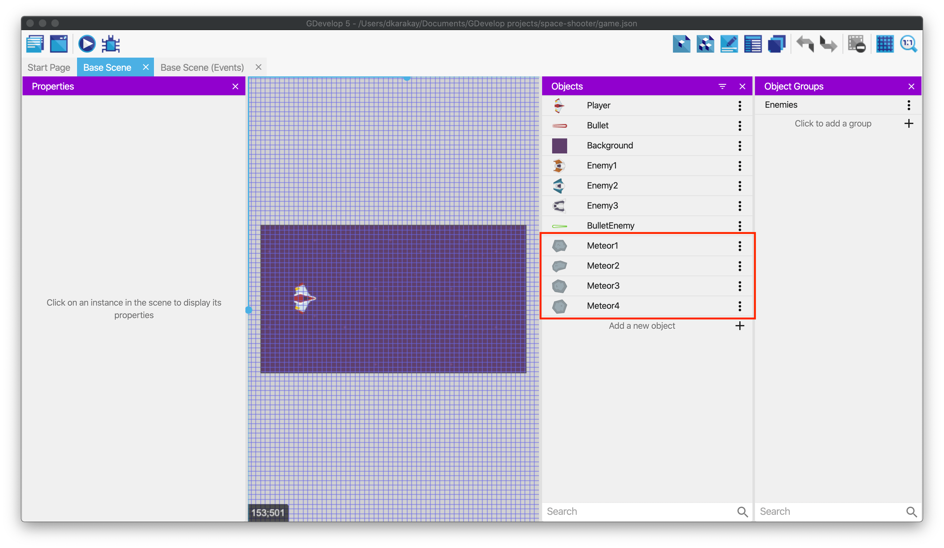 We will use object groups to control multiple meteor objects at once, especially in the events. Create a new object group called "Meteors" and add the meteor objects.